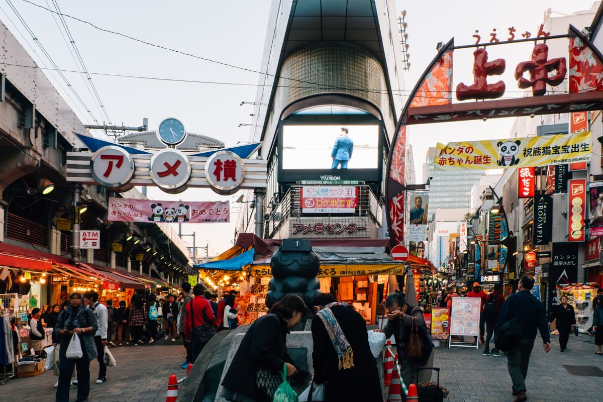 สวนสาธารณะขนาดใหญ่ที่คนชอบไปดูแพนด้าในสวนสัตว์ เดินสวนรับออกซิเจนเสร็จก็ข้ามฝั่งมาละลายทรัพย์ ซื้อรองเท้าผ้าใบ และกินสตรีทฟู้ดราคาถูกที่ตลาดอาเมะโยโกะ แฟนผลไม้เสียบไม้ต้องมา!