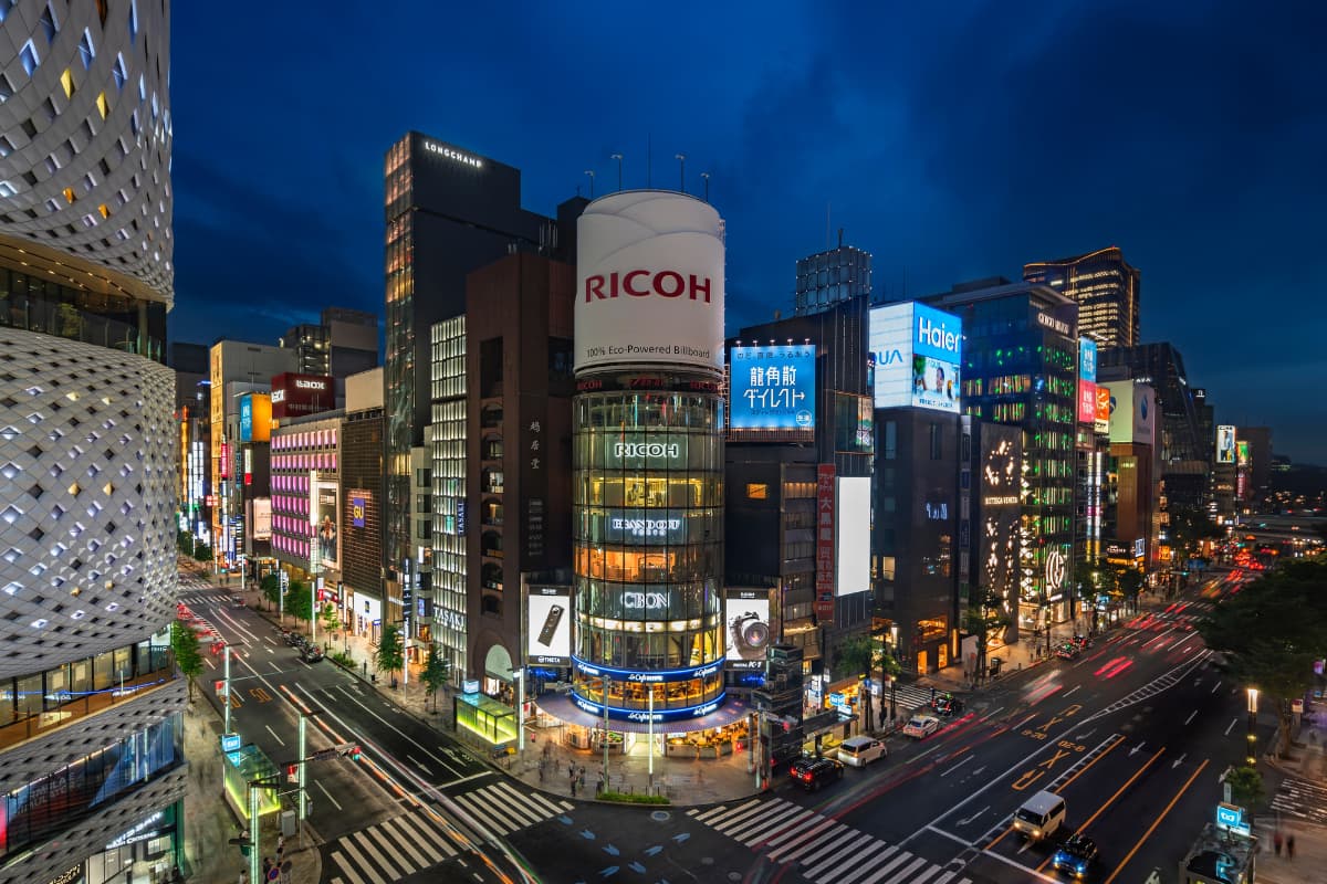 ถนนชอปปิงไฮเอนด์สุดหรู แหล่งรวมแบรนด์เนมระดับโลกและห้างสรรพสินค้าเก่าแก่ ไฮไลต์คือทุกบ่ายวันเสาร์-อาทิตย์เขาจะปิดถนนหลักให้คนลงไปเดินชิลๆ เป็นถนนคนเดิน (Hokosha Tengoku) ที่ดูแพงและถ่ายรูปสวยมาก