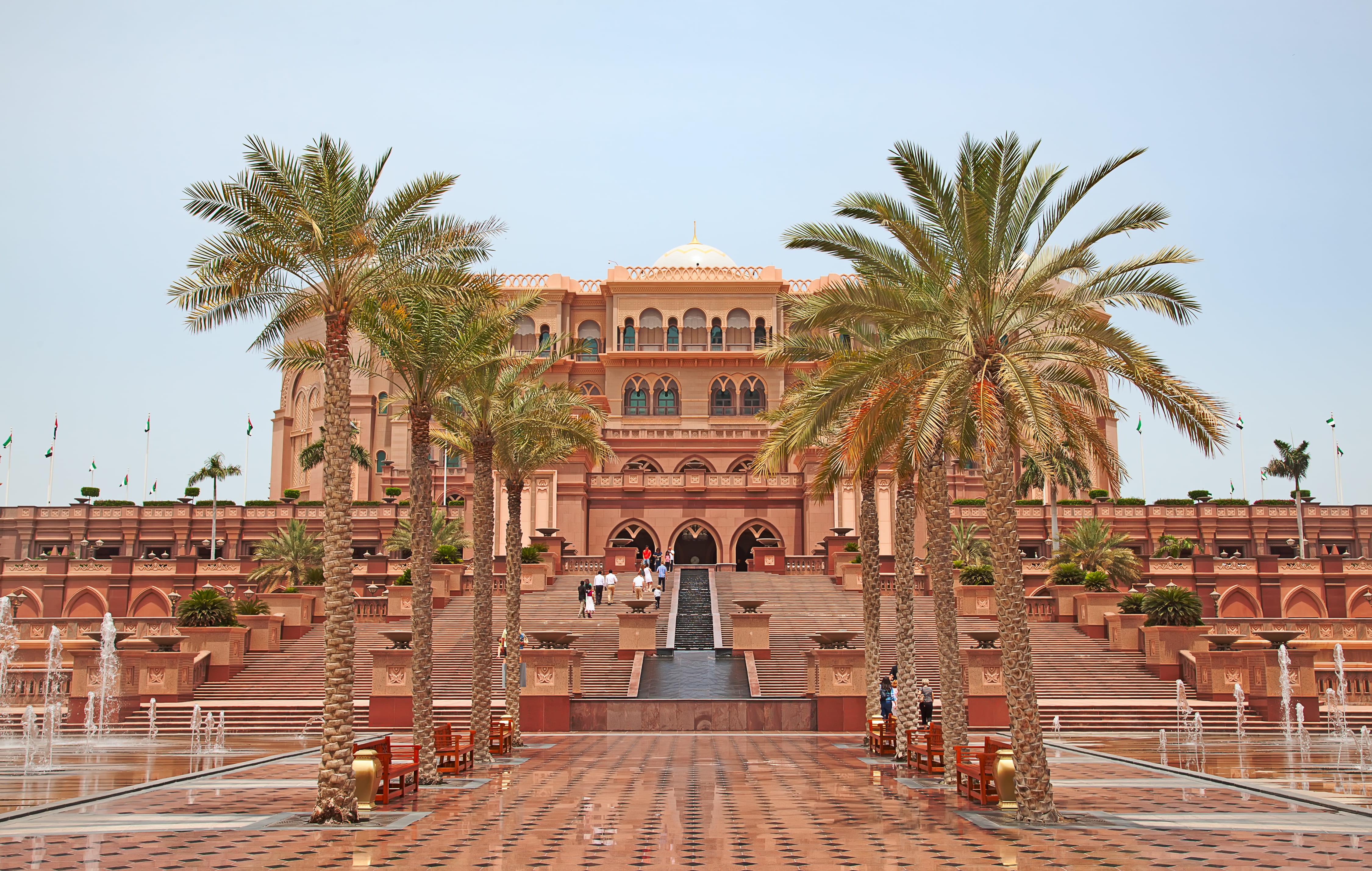 เราแวะที่แรกกันที่ โรงแรม เอมิเรตส์ พาเลซ (Emirates Palace) ในกรุงอาบูดาบี (Abu Dhabi) เมืองหลวงของประเทศสาธารณรัฐอาหรับเอมิเรตส์ (UAE) โรงแรมี่มีเทคโนโลยีทันสมัยที่สุด และสิ่งอำนวยความสะดวกมากมาย โดยโรงแรมเปิดให้บริการเมื่อปี ค.ศ.2005 (พ.ศ.2548) ใช้งบประมาณในการก่อสร้างถึง 3,000 ล้านเหรียญสหรัฐ หรือประมาณ 96,000 ล้านบาท จากการใช้ เงิน ทอง และหินอ่อน เป็นวัสดุในการก่อสร้าง ประติมากรรมหรือสถาปัตยกรรม สไตล์อาหรับ และโรงแรมแห่งนี้ยังติดตั้งโคมไฟระย้าที่ทำขึ้นมาจากแก้วคริสตัลของ “สวารอฟสกี้” เป็นจำนวนถึง 1,002 ชิ้น ตัวโรงแรมนั้นตั่งอยู่ ที่ริมชายหาด ยาวประมาณ 1.3 กิโลเมตร และตัวตึกโรงแรมเอง มีความกว้างประมาณ 850,000 ตารางเมตร ออกแบบโดยสถาปนิกชื่อดังชาวอังกฤษ นามว่า John Elliot เราตั้งใจจะแวะมาจิบกาแฟ แต่ร้านยังไม่เปิดเลยอดเลยได้แต่ชื่นชมความงามของโรงแรมไป