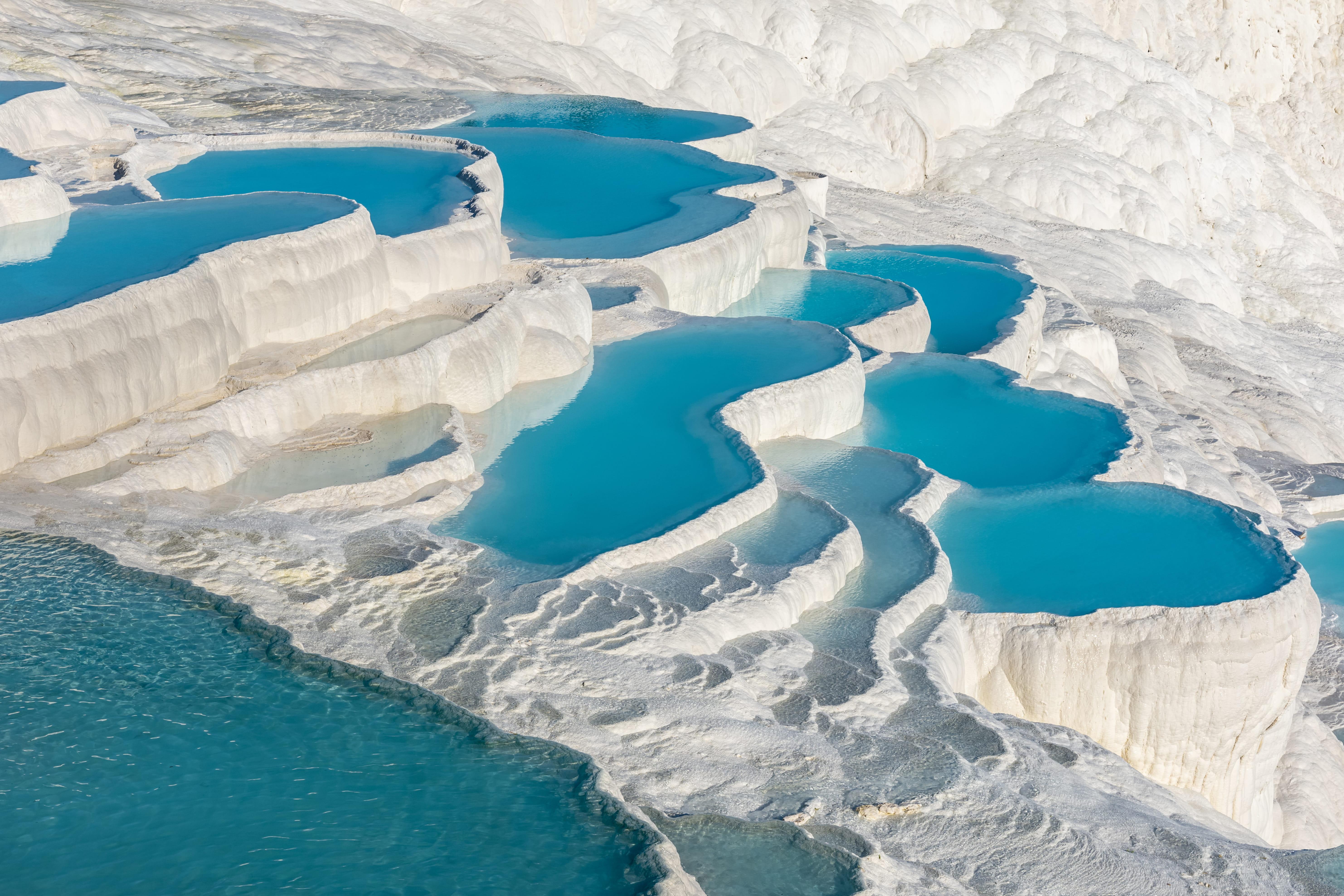 ใครที่ชอบทำสปา จะต้องเลิฟที่นี่อย่างแน่นอนครับ เป็นบ่อน้ำพุร้อนที่มีชื่อเสียงมากในหมู่นักท่องเที่ยว ที่นี่เป็นแหล่งน้ำพุร้อนธรรมชาติ เกิดจากความดันความร้อนใต้พื้นดินที่ 35- 36 องศาเซลเซียสเลยทีเดียว ว่ากันว่าน้ำพุร้อนที่นี่มีอายุมากว่า 14,000 ปี ทำให้ตะกอนที่ไหลฝั่งตัวทับรวมกันจนเป็นตะไคร่น้ำสีขาว และกลายเป็นปราสาทปุยฝ้ายแบบนี้นั่นเองล่ะครับ