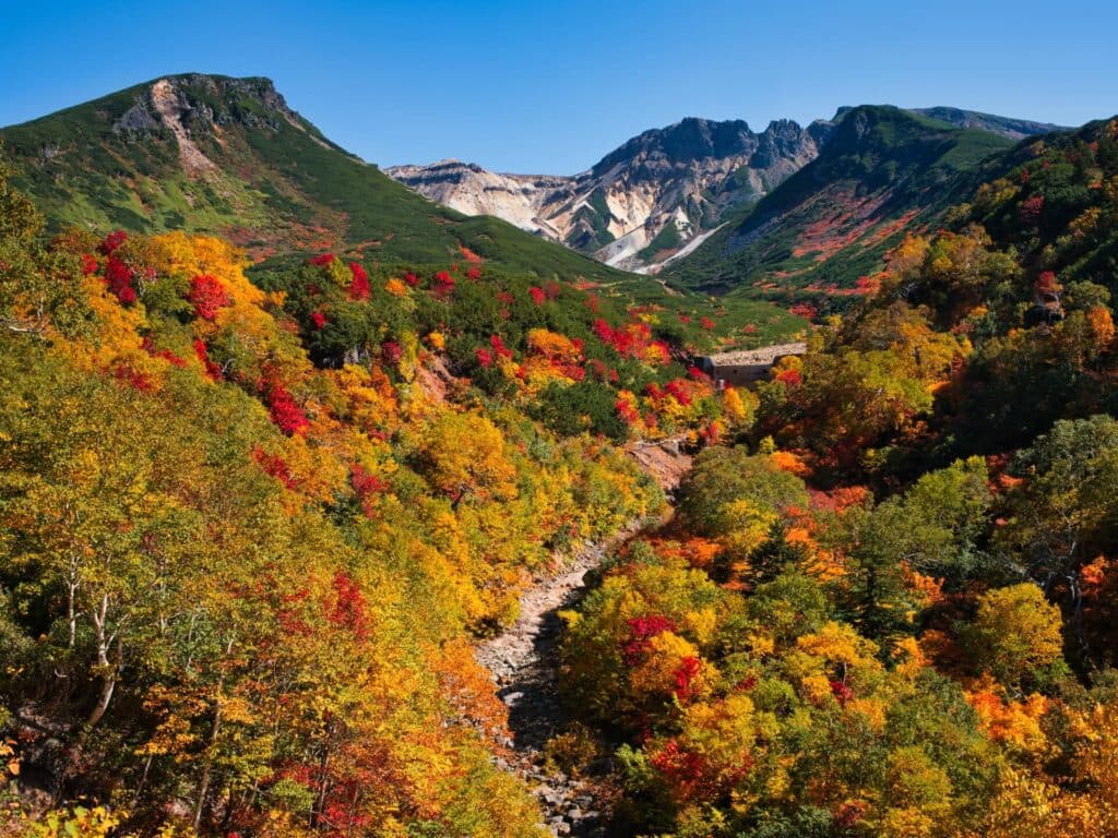 สายธรรมชาติเราขอแนะนำชมใบไม้เปลี่ยนสี ฮอกไกโดที่นี่เลยยอดเขาคุโรดาเกะ เพราะหากมาเที่ยวที่นี่ทุกคนจะได้เห็นการเปลี่ยนสีใบไม้ทั่วทั้งภูเขาคุโรดาเกะ ซึ่งมีความสูงถึง 1,984 เมตร ทางเริ่มต้นจะอยู่ที่หมู่บ้านในหุบเขาโซอุนเคียว ภายในหมู่บ้านจะมีทั้งโรงแรม ออนเซ็น ร้านอาหาร สิ่งอำนวยความสะดวกต่างๆ นอกจากนั้นถ้าเราเดินทางไปยังยอดเขาคุโรดาเกะ จะมีกระเช้าขึ้นไปยังสถานี Upper Station เป็นจุดที่เราจะได้เห็นวิวจากด้านบนซึ่งมีความสวยงามอย่างมาก ก่อนที่เราจะเดินทางไปยังยอดเขาคุโรดาเกะระหว่างทางสามารถแวะชมธรรมชาติของดอกไม้หลากหลายชนิดตลอดเส้นทาง แต่การเดินทางอาจจะมีความลำบากบ้างแต่รับรองว่าคุ้มค่าแน่นอน เพราะเราจะได้ชมวิวอันสวยงามของธรรมชาติในฤดูใบไม้เปลี่ยนสีที่ฮอกไกโด