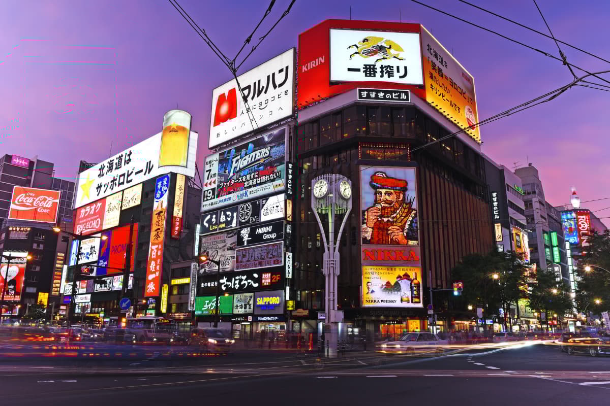 ย่านซูซูกิโนะ (Susukino) ย่านกินดื่มที่คึกคักที่สุดในฮอกไกโด มาถ่ายรูปกับป้ายไฟลุง Nikka แล้วไปเดินหาของกินที่ตรอกราเมน (Ramen Yokocho) เพื่อซู้ดซัปโปโรมิโซะราเมนร้อนๆ รับรองว่าคอมพลีตทริป