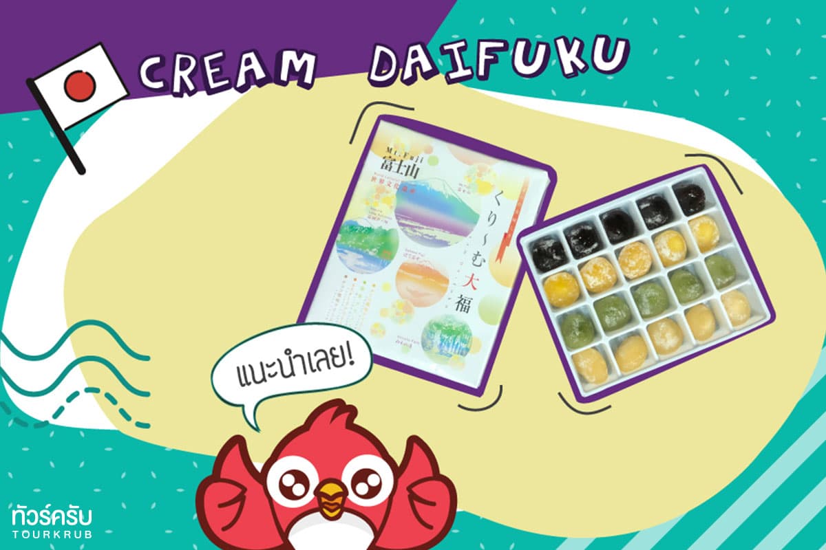 หลังจากได้ชิมไดฟุกุบ้านเรากันจนเบาหวานขึ้นไปแล้ว ก็ได้โอกาสชิมไดฟูกุจากต้นตำหรับสักที แถมยังไม่ใช่ไดฟุกุธรรมดา เพราะ ไดฟูกุสอดไส้ครีมหอมหวาน ผสมผสานกับแป้งเหนียว นุ่ม หนึบหนับ รสชาติหวานเล็กๆ ซึ่งเข้ากันได้เป็นอย่างดีกับไส้ครีมด้านใน มีทั้งรสคัสตาร์ด รสชาเขียว รสชีส และรสช็อคโกแลต ถึงรสชาติจะต่างกัน แต่อร่อยไม่แพ้กันแน่นอน