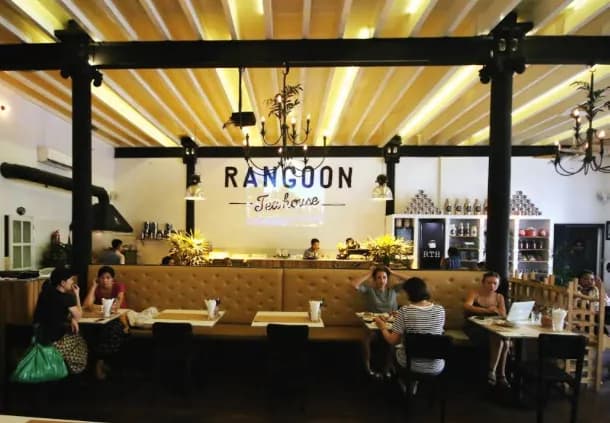 Rangoon Tea House ร้านอาหารพื้นเมืองพม่าฟิวชั่นที่ดูดีเว่อร์ให้สมกับการเป็นร้านชิค ๆ ในเมืองหลวงเก่าอย่างเมืองย่างกุ้ง คาเฟ่สไตล์โคโลเนียลเท่ ๆ สุดทันสมัย กับการผสมผสานความทันสมัยและความคลาสสิคให้เข้ากันได้อย่างลงงตัว เข้ากันกับลักษณะอาหารในร้านที่เป็นอาหารแนวฟิวชั่นเข้ากับยุคสมัย นอดจากบรรยากาศสุดคูลของร้านแล้ว ทีเด็ดของร้านนี้อยูที่เจ้าเมนูเด็ดสูตรลับเฉพาะของทางร้านอย่าง Rib Rack Bao เมนูหน้าตาคล้ายหมั่นโถว กับซี่โครงหมูหมักย่างราสซอสสุดพิเศษที่ถูกห่อหุ้มด้วยแป้งสีขาวจั๊วเนื้อนวลนุ่มสุดละมุมนลิ้น ที่ทำให้อาหารท้องถิ่นดูมีราคาขึ้นอย่างน่าประหลาดในรสชาติออริจินอลที่ลงตัว กับเครื่องดื่มซิกเนเจอร์อย่างชาชัก ชารสเลิศหอมหวานกำลังดีรสนุ่มละมุน