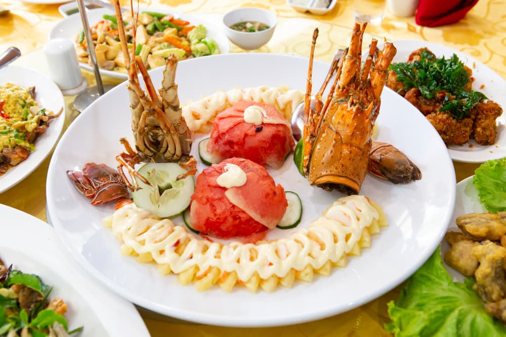 กลับมาที่เมนูสลัด แต่ยังคงอยู่ที่กุ้งกันบ้าง กับอาหารขึ้นชื่อของพม่ากับเมนู สลัดกุ้งมังกร เป็นอาหารที่ใครๆ ที่ไปเยือนพม่าต้องได้ลองชิมจะเป็นเนื้อกุ้งมังกรหั่นชิ้นวางเรียงสวยในจาน พร้อมกับหัวกุ้งมังกรตัวใหญ่วางประดับแค่นึกภาพน้ำลายก็ไหลแล้ว เป็นภาพที่ออกมาสวยงามไม่แพ้ภัตาคารกันเลย ยิ่งได้เนื้อกุ้งมังกรเน้นๆ สำหรับคนสายกินกุ้งคงฟินไม่ใช่น้อยกับเมนูนี้ รสชาติจะมีความกลมกล่อมอร่อยจริงขอการันตีเลย แถมได้ประโยชน์จากผักอีกด้วยนะ