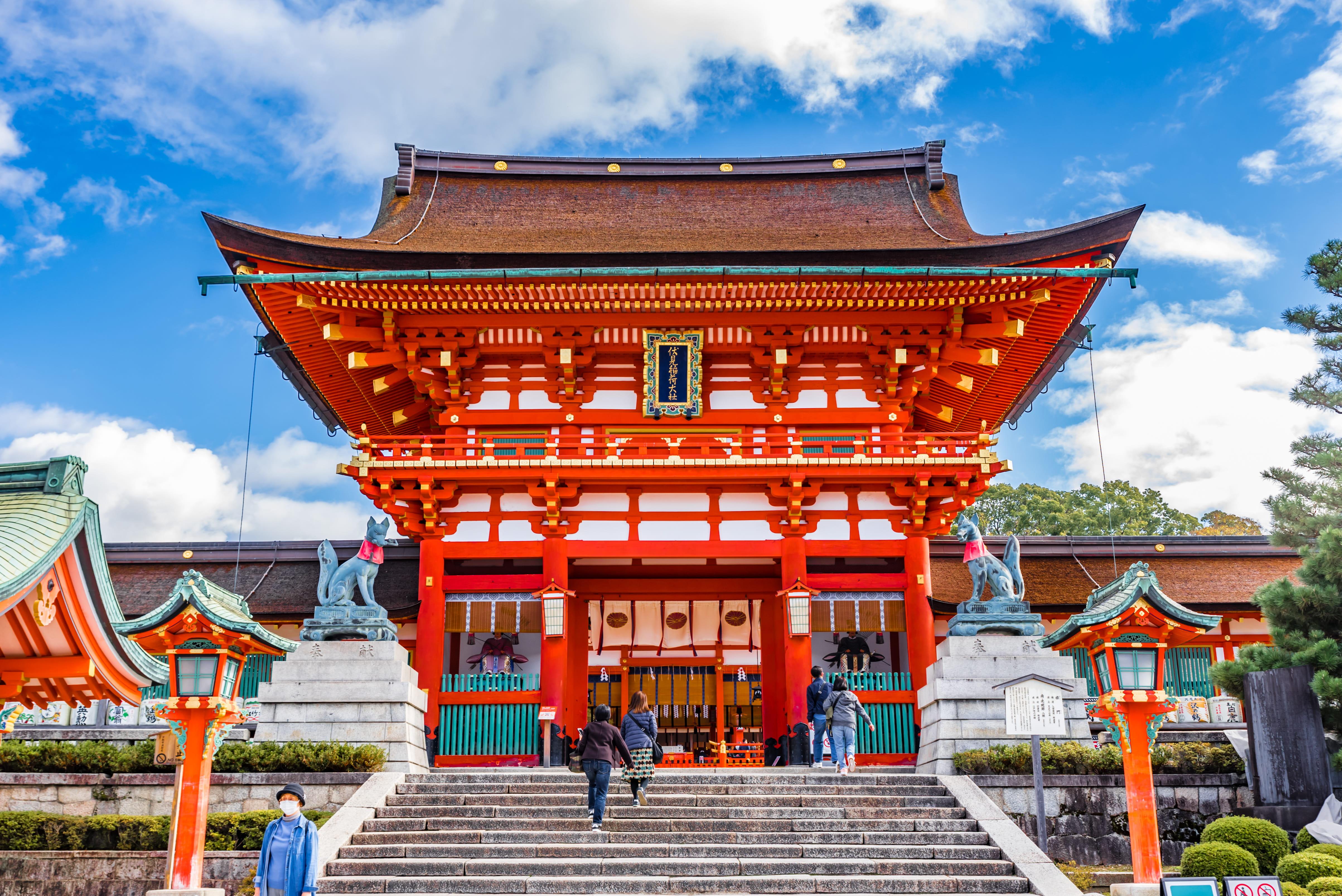 ฟูชิมิอินาริ - Fushimi Inari-taisha ศาลเจ้าเทพอินาริ มีชื่อเสียงโด่งดังจากประตูโทริอิ (Torii Gate) หรือเสาประตูสีแดงที่เรียงตัวกันข้างหลังศาลเจ้าจำนวนหลายหมื่นต้นจนเป็นทางเดินได้ทั่วทั้งภูเขาอินาริ ที่ผู้คนเชื่อกันว่าเป็นภูเขาศักสิทธิ์ และยิ่งดังเข้าไปอีก เมื่อไปแจ้งเกิดในภาพยนตร์ฮอลลีวู้ด ทำให้เป็นอีก1สถานที่ ที่ดึงดูดนักท่องเที่ยวเป็นอย่างมาก