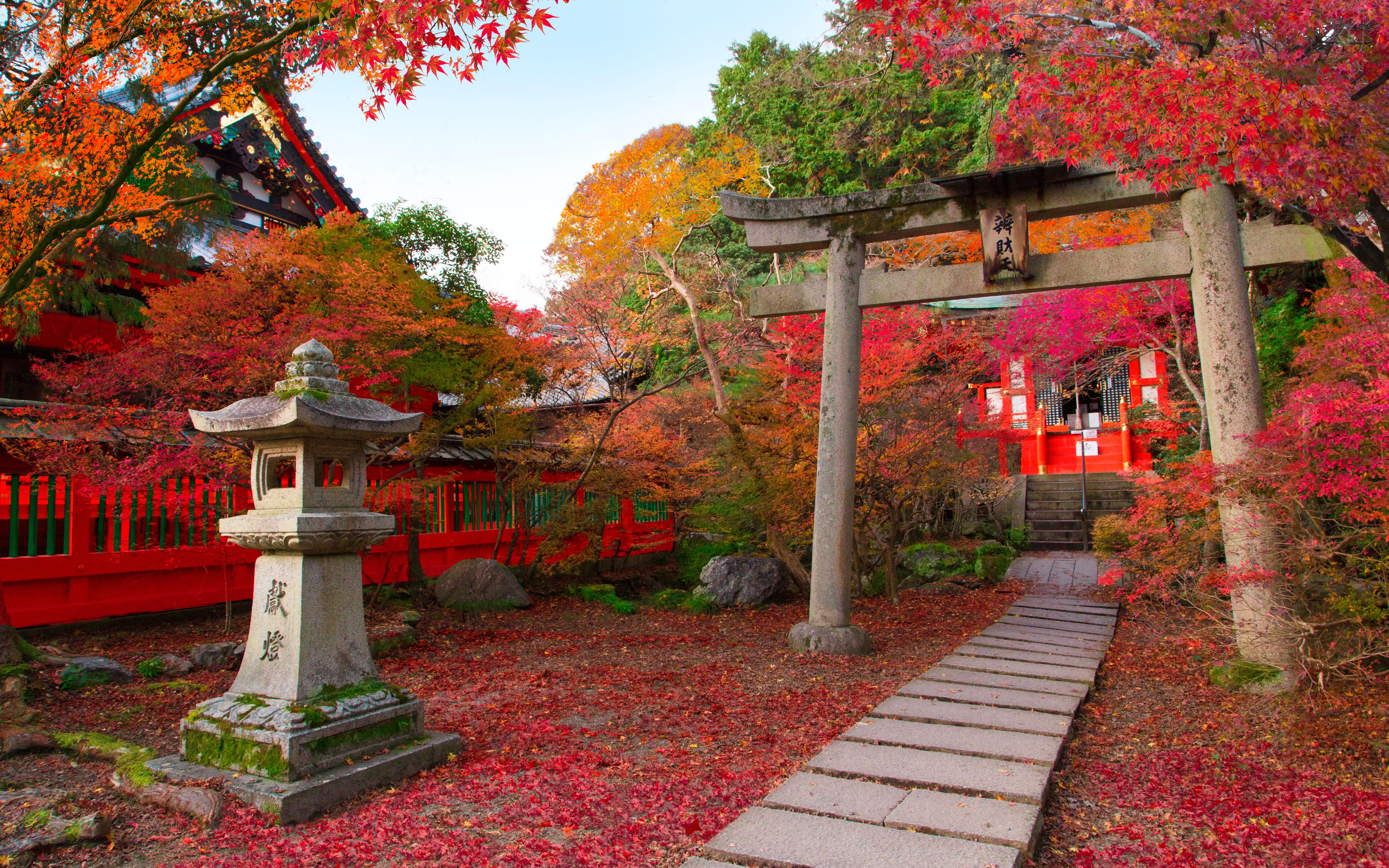 จุดชมใบไม้เปลี่ยนสีที่สวยที่สุดอีกแห่งของเกียวโต ใบเมเปิ้ลสีแดงจะร่วงมาปกคลุมทางเดินยาวตลอดแนวจนไปถึงวัด ทำให้ดูเหมือนเป็นอุโมงค์ต้นไม้เปลี่ยนสี