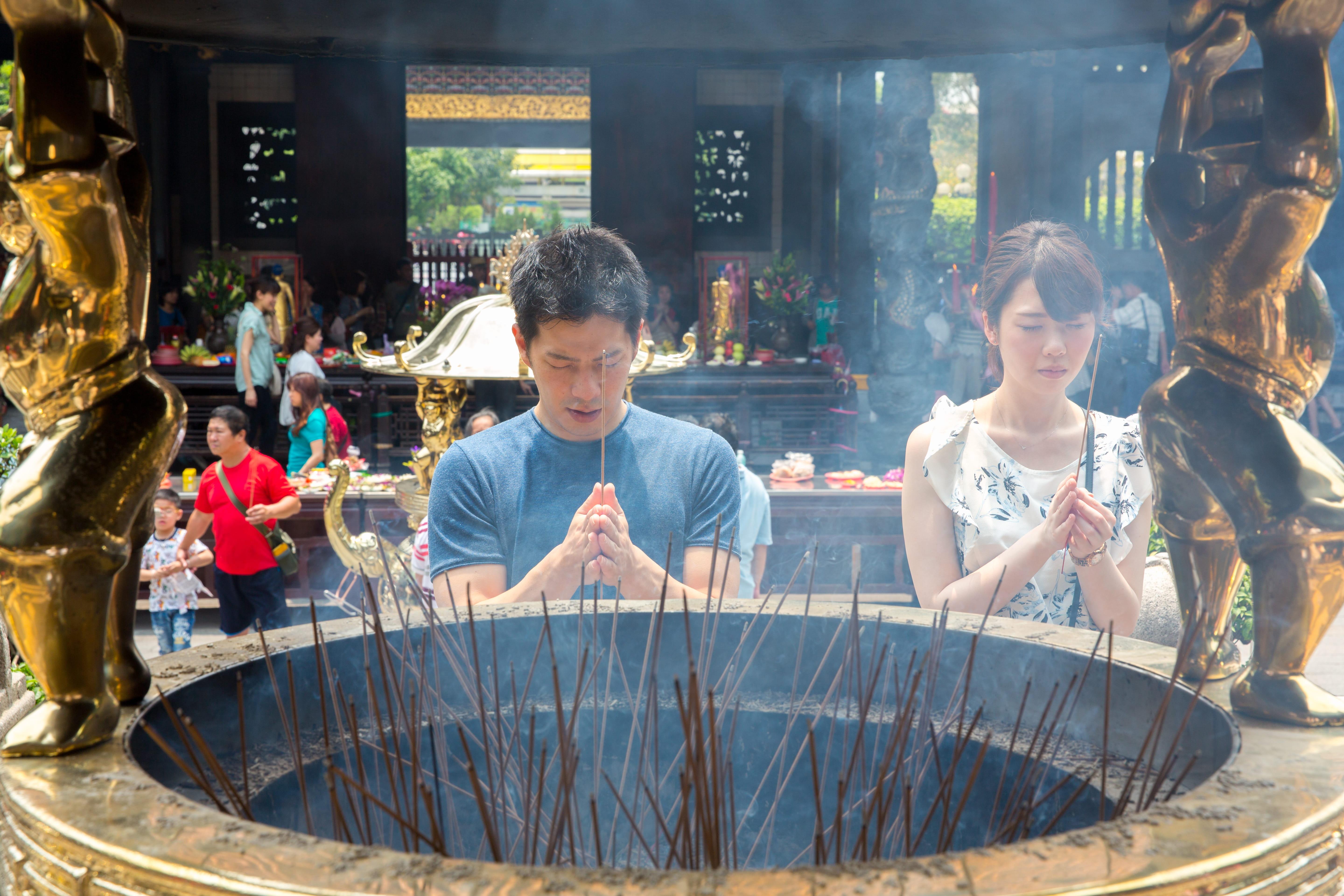 1.จุดธูปสักการะที่กระถางธูปทั้งเจ็ด ที่ตั้งอยู่หน้าศาจเจ้าเทพเฒ่าจันทรา