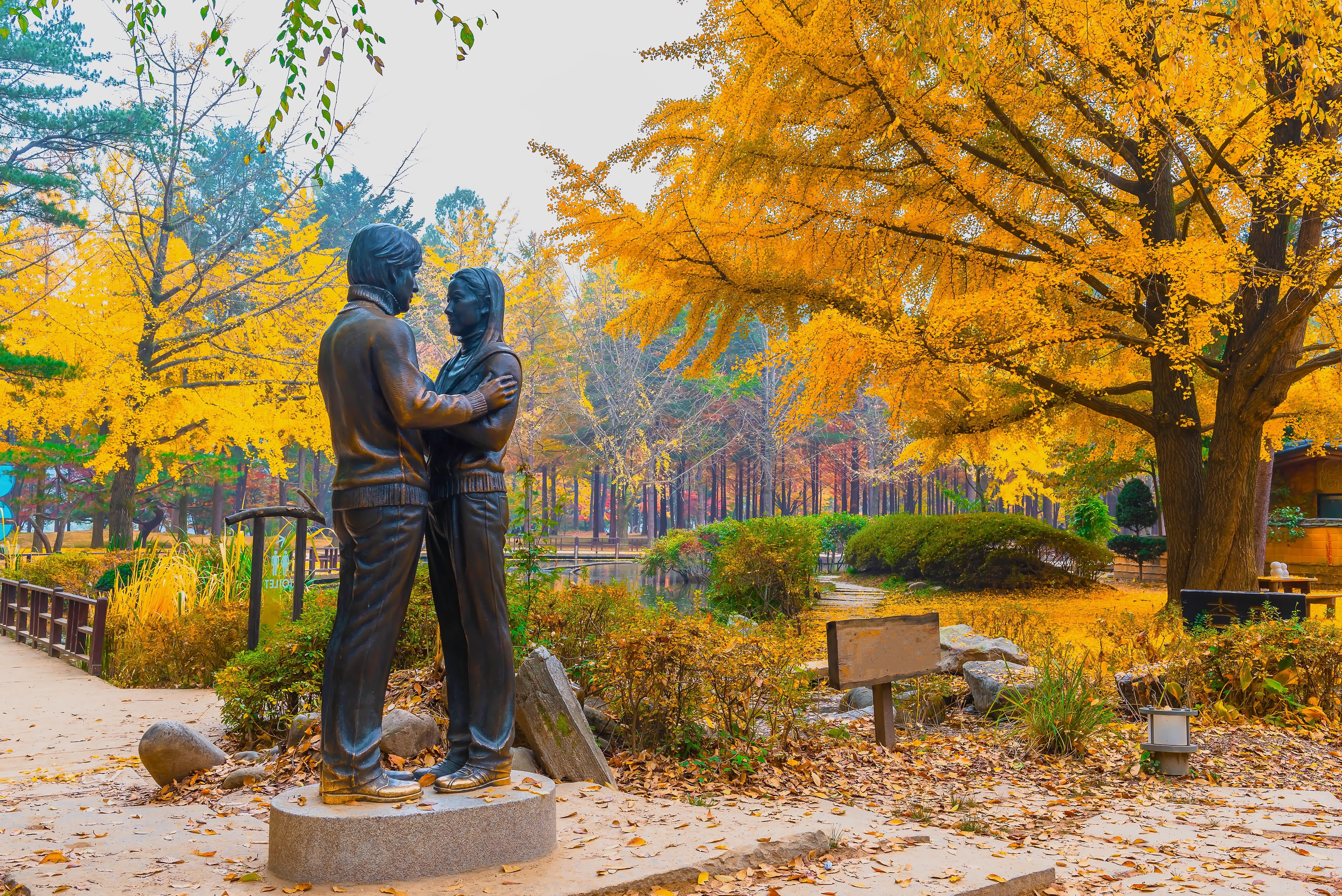 เที่ยวเกาหลี 4 วัน 3 คืน จุดแรกเลยที่เราไปบน เกาะนามิ คือ รูปปั้นคู่พระนางจากเรื่องเพลงรักในสายลมหนาว (Winter Sonata Statue) เป็นรูปปั้นชื่อดังที่เห็นกันมากมายในซีรีย์เกาหลี เป็นรูปปั้นของเบยองจุน (Bae Yong Joon) และ แชงจีอู (Choi Ji Woo) ดาราเกาหลีชื่อดัง เป็นจุดที่มีแฟนคลับมาถ่ายรูปเป็นจำนวนมากและสายแปะก๊วย (Ginkgo Tree Lane) เป็นถนนที่มีต้นแปะก๊วยเป็นจำนวนมากกว่า 80 เมตร ซึ่งช่วงที่เราเป็นช่วงใบไม้กำลังเปลี่ยนสีพอดี ที่เปลี่ยนจากสีเหลืองเป็นสีแดงส้ม ซึ่งบนเกาะนามิยังมีสถานที่ท่องเที่ยวอีกมากมายแต่เวลาหมดก่อนเลยได้แต่ถ่ายรูปแถวๆ นั้น
