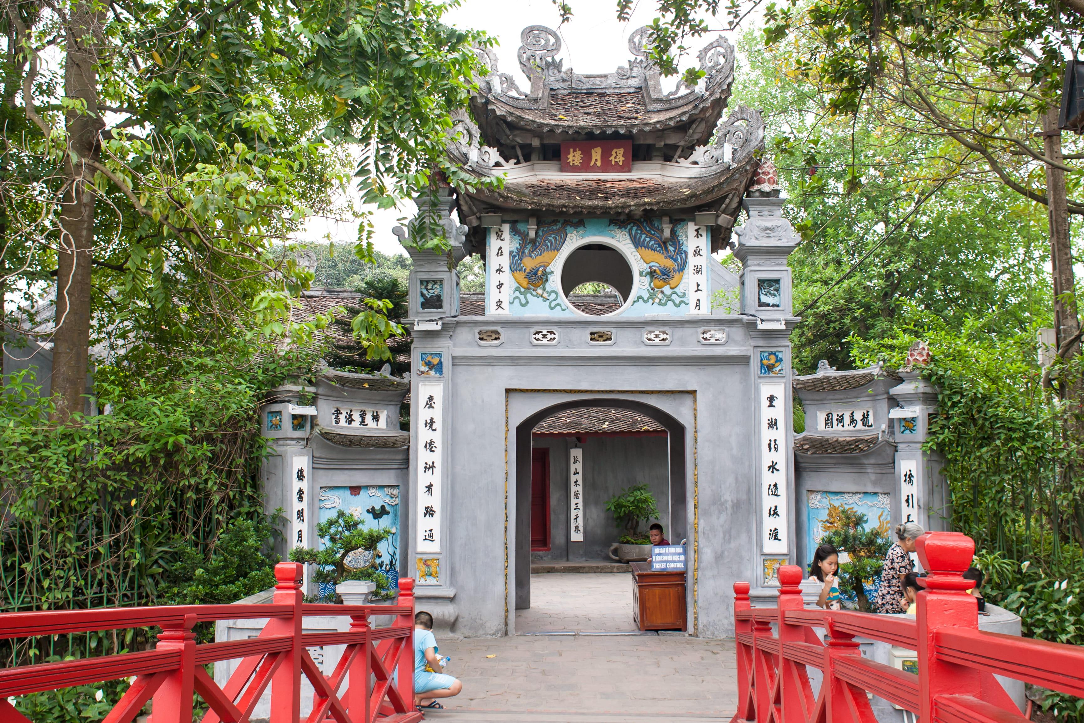 วัดโบราณ ซึ่งภายในประกอบด้วยศาลเจ้าโบราณและอนุสาวรีย์ของตรันคว็อกตวน ซึ่งเป็นแม่ทัพเอกในการต่อสู้กับกองทัพมองโกล ภายในประกอบด้วย ศาลเจ้าโบราณ และเต่าสต๊าฟขนาดใหญ่ ซึ่งเชื่อกันว่าเต่าตัวนี้คือเต่าศักดิ์สิทธิ์ 1 ใน 2 ตัวที่อาศัยอยู่ในทะเลสาบแห่งนี้มาเป็นเวลาช้านาน อยู่ริมทะเลสาบคืนดาบ เป็นเกาะเล็กๆ ในทะเลสาบ มีสีแดงสดใส ถือเป็นเอกลักษณ์อย่างหนึ่งของการเที่ยวฮานอย