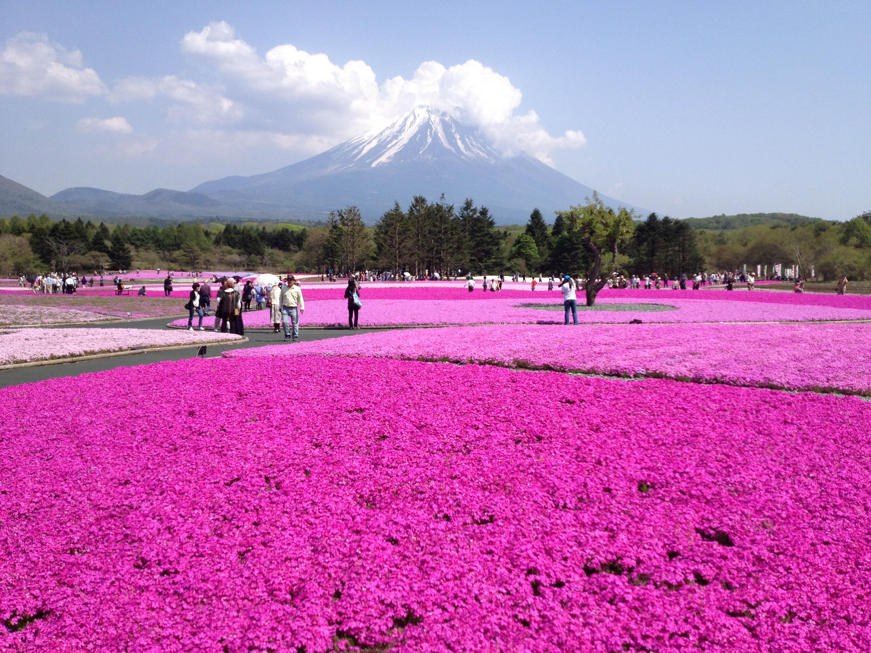 นักท่องเที่ยวจะได้ชมทิวทัศน์ที่งดงามของทุ่งดอกชิบะซากุระอันกว้างใหญ่มีฉากหลังเป็นภูเขาไฟฟูจิที่สูงตระหง่านในวันที่ฟ้าโปร่งใส